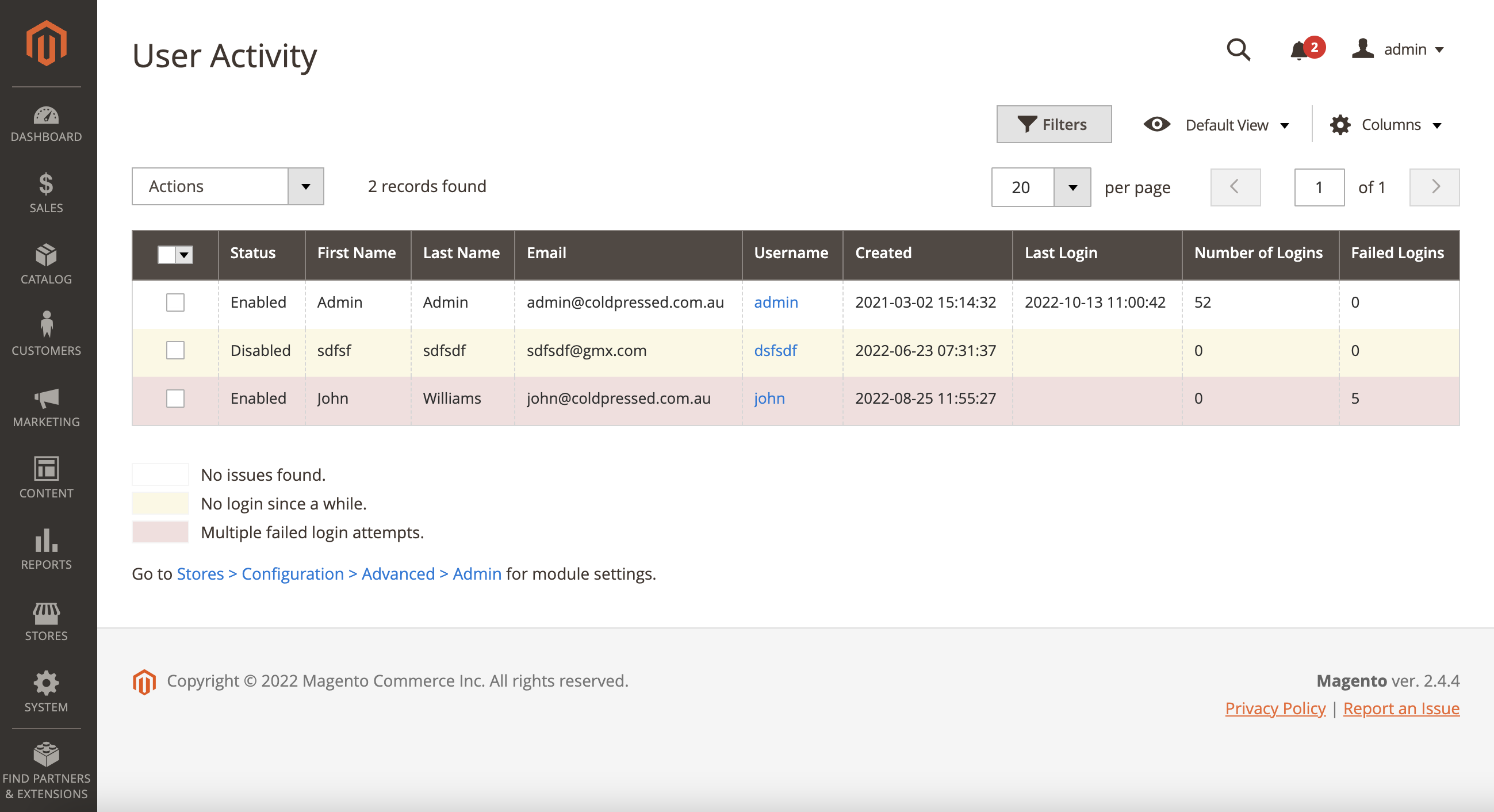 Go to System > Permissions > User Activity to see all admin users sorted by the last login date.