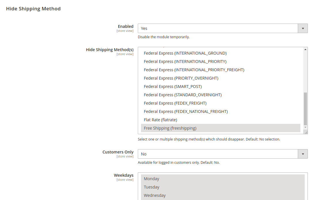 Hide Shipping Method allows admin users to hide one or multiple shipping methods on the cart and checkout page. This can be limited to specific weekdays, by start and end-date or customer sessions.