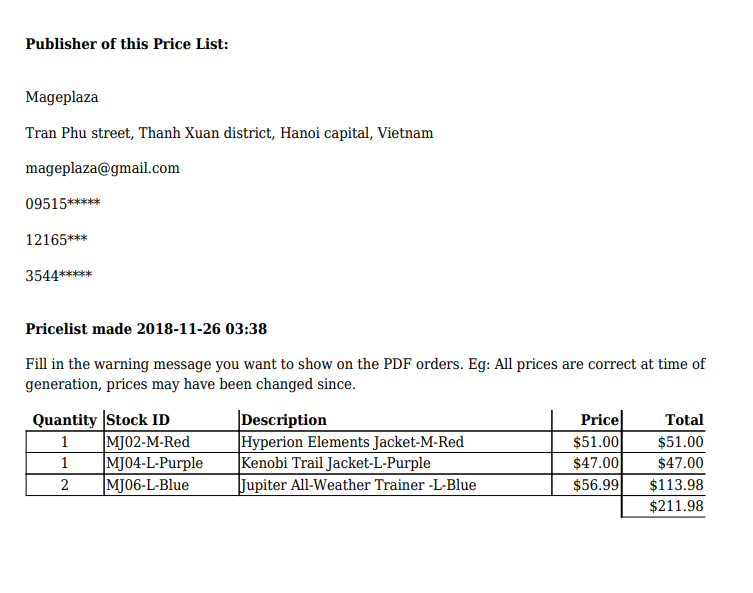 - Warning Message: This field is for the special content you want to notice in the PDF orders. For instance: Prices are correct at the time of generation, some possibly have been changed since.
