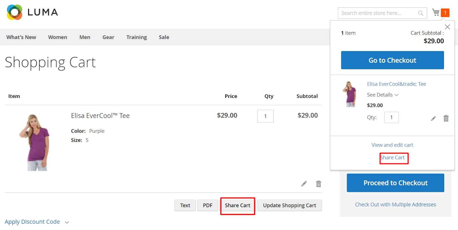 - Share Cart button displays in the Minicart section when adding items to cart.