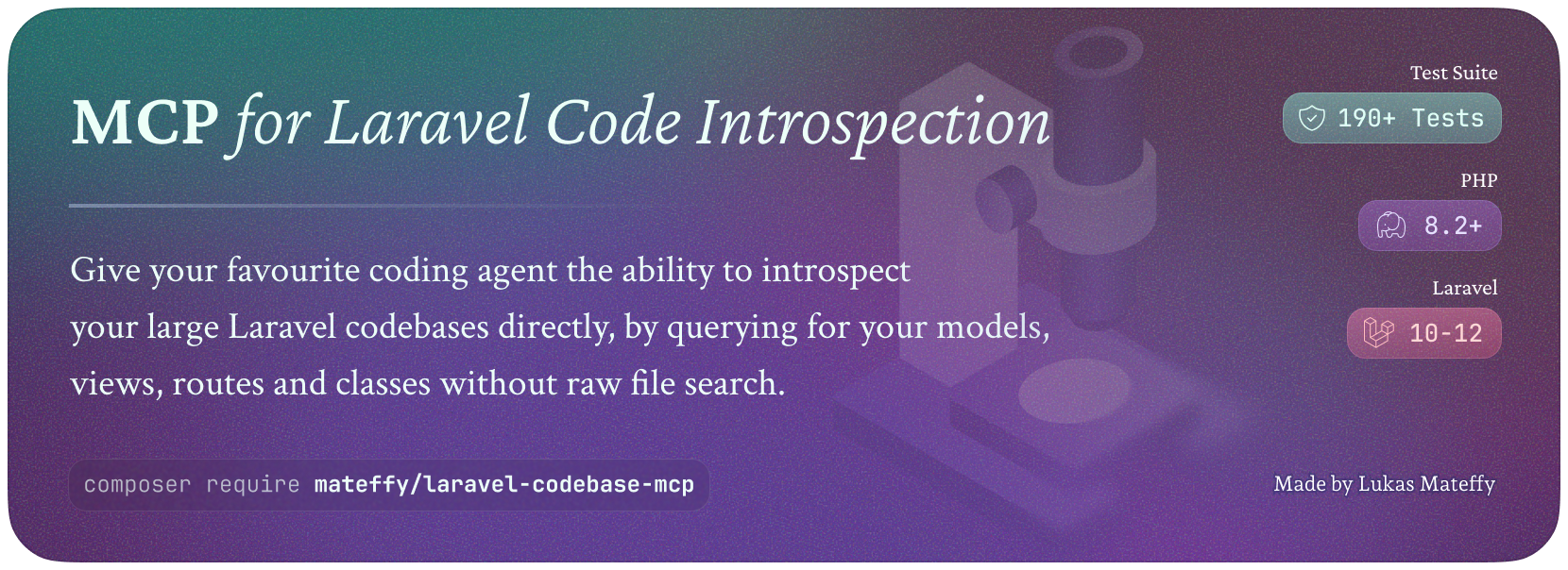 For AIs to make sense of your codebase, they need to be able to know what's in it. While vector search is a powerful tool for searching through code, it uses a lot of tokens and doesn't even give you the full picture of your codebase for things like views or routes. This package implements a Model Context Protocol (MCP) server for the mateffy/laravel-introspect package, which allows you to introspect your codebase and get structured information about it.