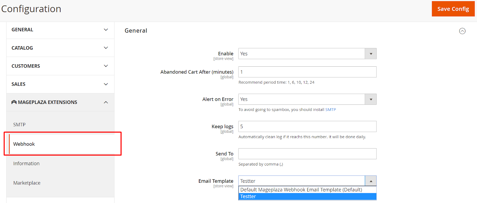 Login to the Magento Admin, choose Store > Settings > Configuration > Mageplaza Extensions > Webhook