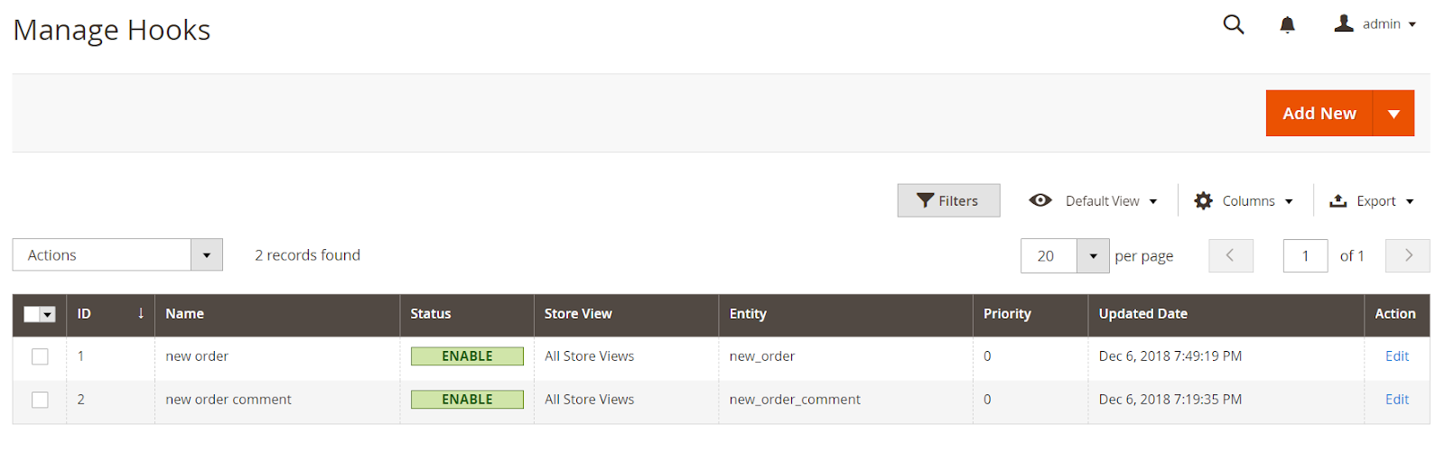 - The grid includes the main hook information: Name, Status, Store View, Entity, Created Date và Update Date,...