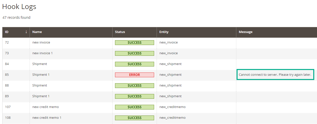 This section will record Webhooks change logs such as Name, Status, Entity, Message, etc.