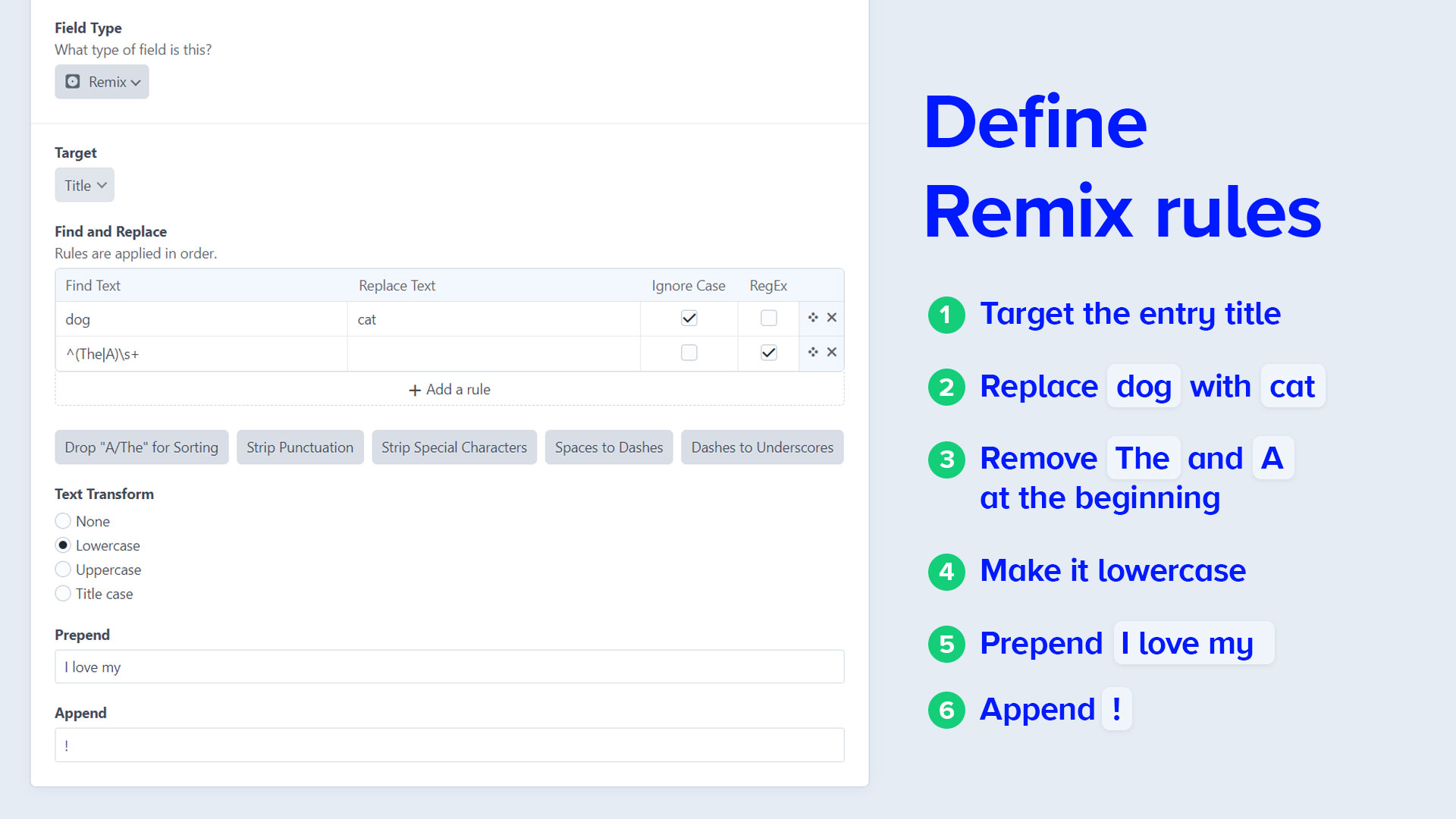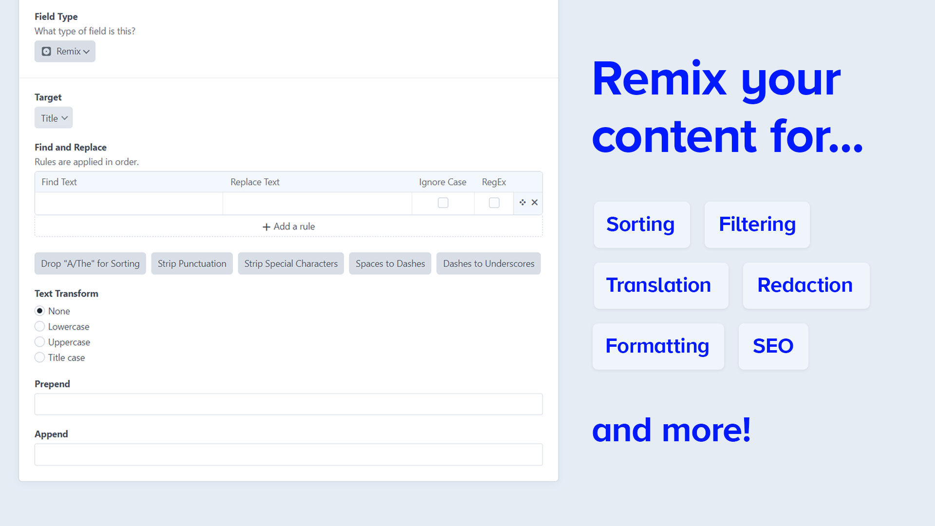 The Remix field outputs the transformed value of your title or slug based on rules you define, including: