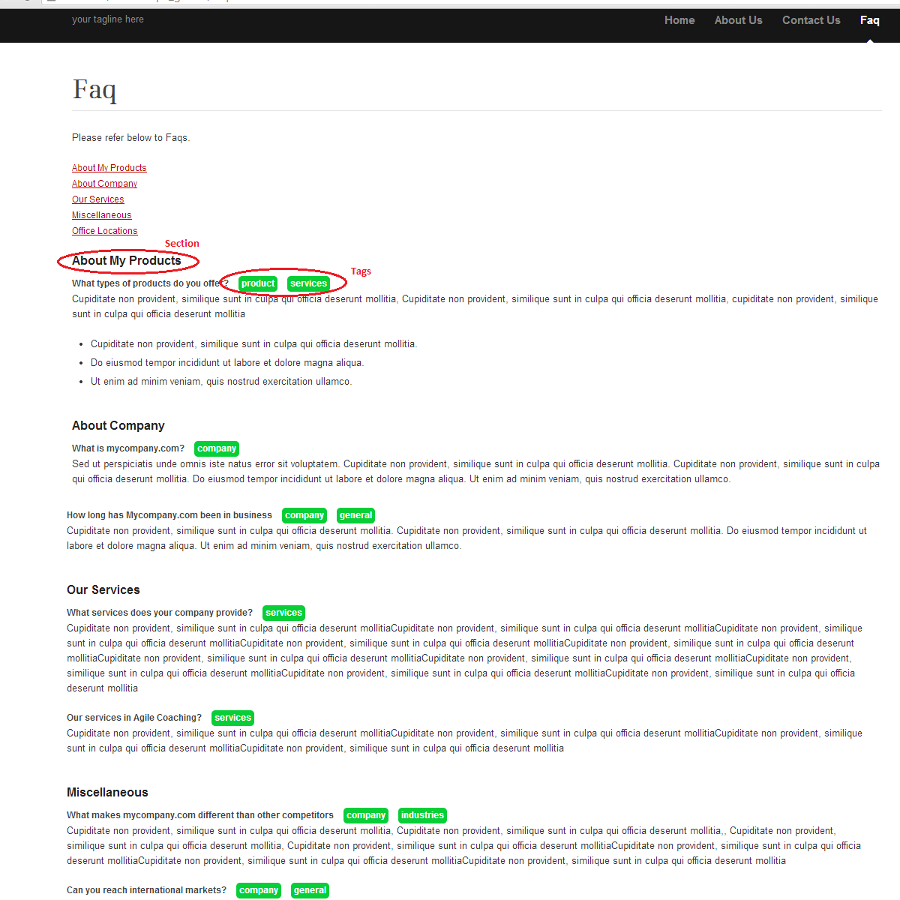 The advancedfaq module allows you to add faqs on your SilverStripe website. Each faq object can have multiple faq-tags and one faq-section attached to it.