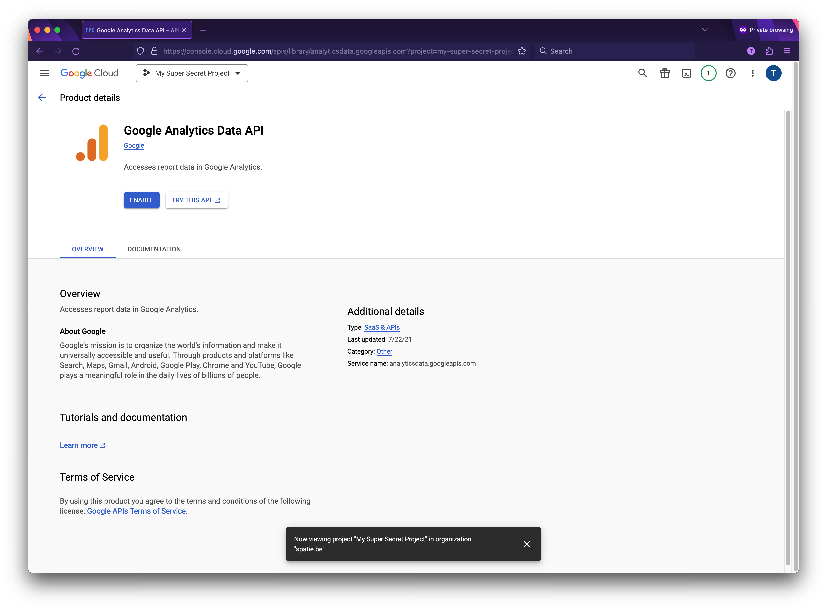 Next up we must specify which API’s the project may consume. Go to the API Library and search for "Google Analytics Data API".
