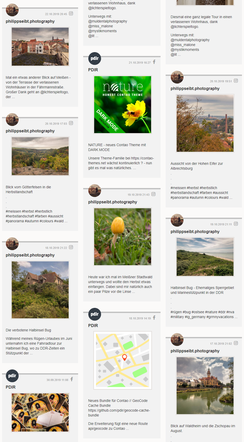 - pdir/social-feed-plus-bundle: Publish news, events or regular pages on all available social media channels at once or do this manually with one click / News, Events oder regulären Seiten auf allen verfügbaren Social Media Kanälen auf einmal veröffentlichen oder dies manuell mit einem Klick tun.