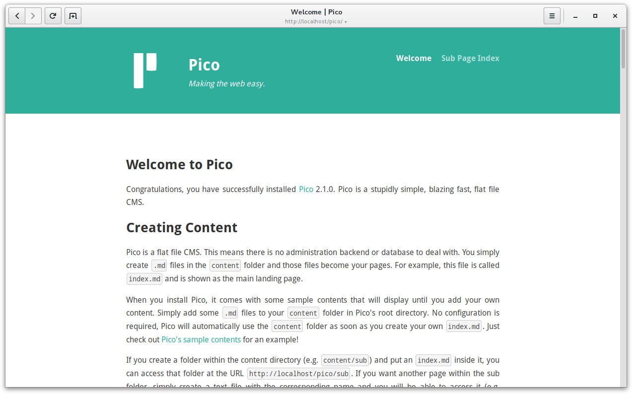 You can now edit the theme's stylesheets and JavaScript to fit your needs. If you rather want to use a third-party theme, simply add the theme's directory to your themes/ directory (e.g. themes/some_other_theme/) and update your config/config.yml accordingly. Pico's default theme is now completely disabled and won't ever interfere with your custom theme or your website in general anymore. If you want to use Pico's default theme again, either remove the line or replace it by theme: default.