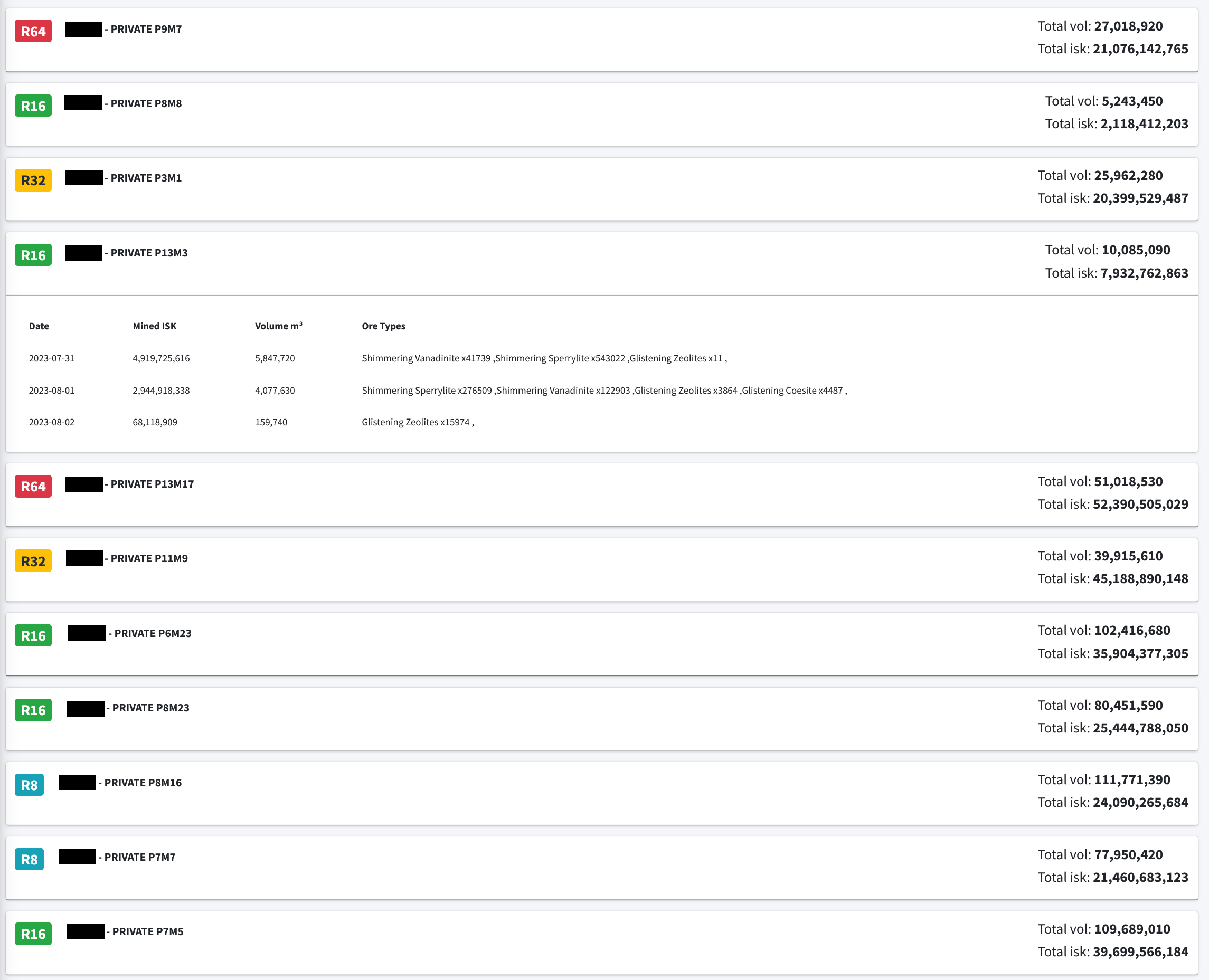 Corporation Moon Minings (Moons owned by Corporation)