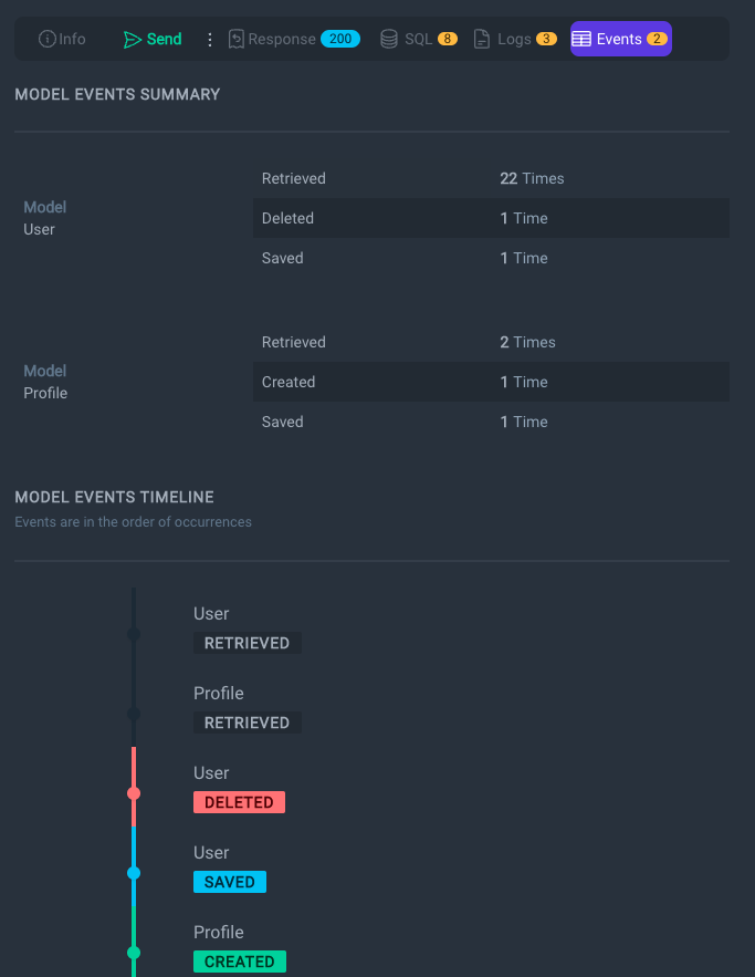 - Request, SQL, response and events timeline below: