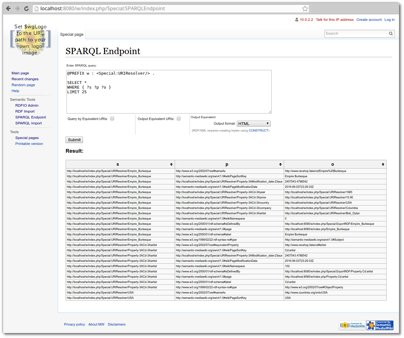 * Semantic Tools ** Special:RDFIOAdmin|RDFIO Admin ** Special:RDFImport|RDF Import ** Special:SPARQLEndpoint|SPARQL Endpoint ** Special:SPARQLImport|SPARQL Import