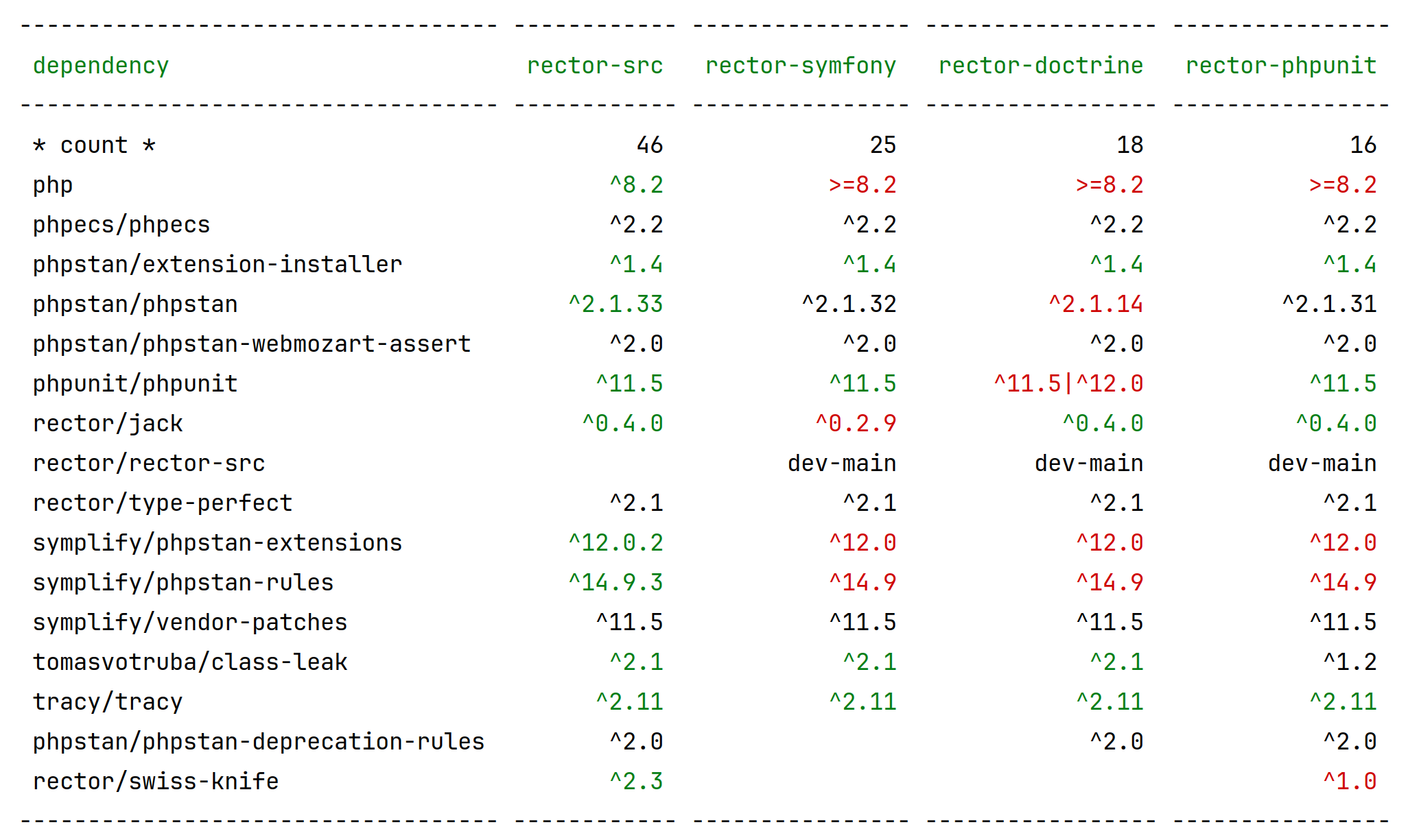This command shows dependency table for each defined repository. It will show which package versions are used in which repositories. This way you can easily spot conflicts between your packages and projects.