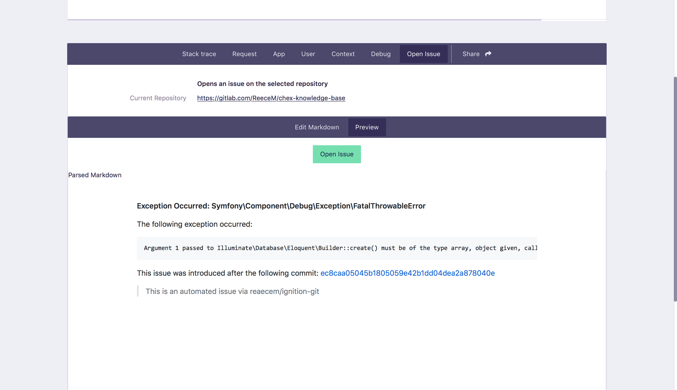 Open a Github, Gitlab Issue from Error page