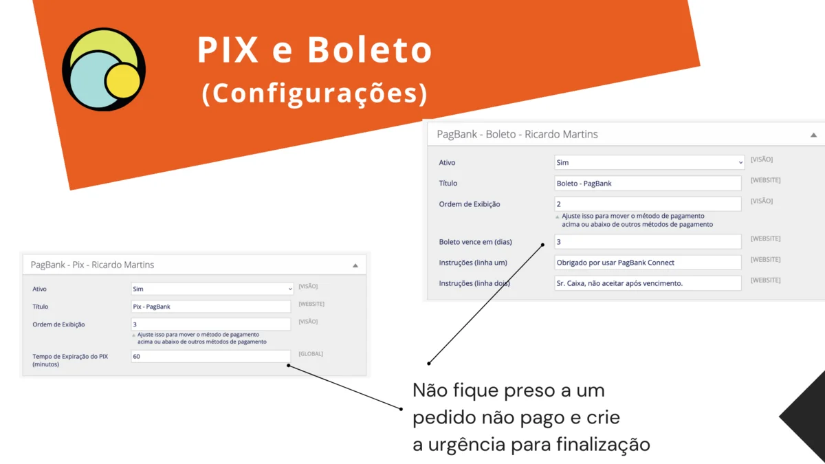 - PIX e Boleto com validades configuráveis