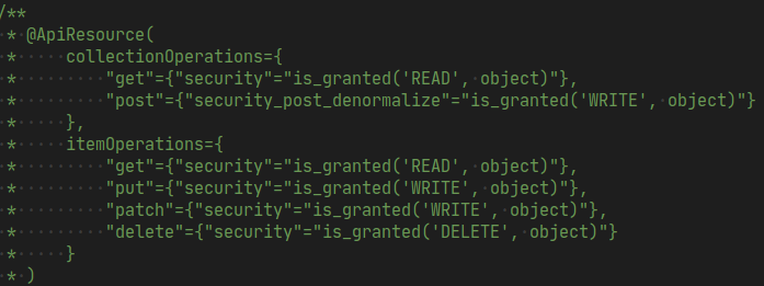As you can see from the previous screenshot the collection operation POST instead of security uses security_post_denormalize, that is because in case of a POST request the data firstly needs to be persisted in doctrine and only afterwards we can check for authorization.