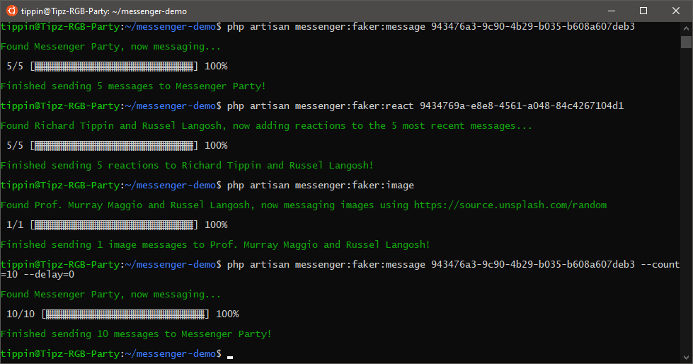 php artisan messenger:faker:message {thread?} | --count=5 | --delay=2 | --admins | --silent