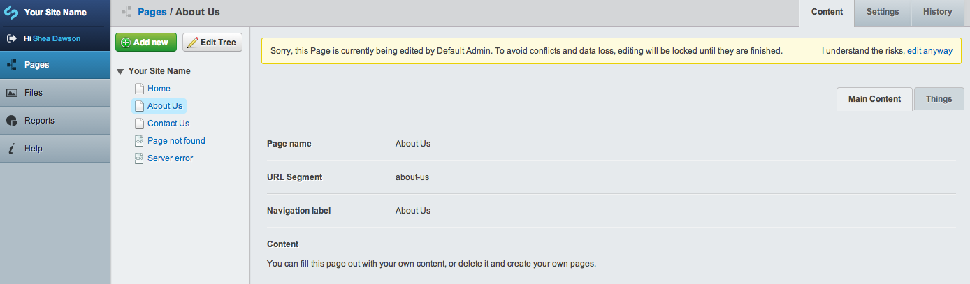 The module will take effect on any DataObject's standard CMS edit form out of the box. A locked object will display a readonly version of the edit form and a message explaining why it's locked and who is editing it. Editing will be re-enabled a maximum of 15 seconds after the original editor has navigated away from the edit form.