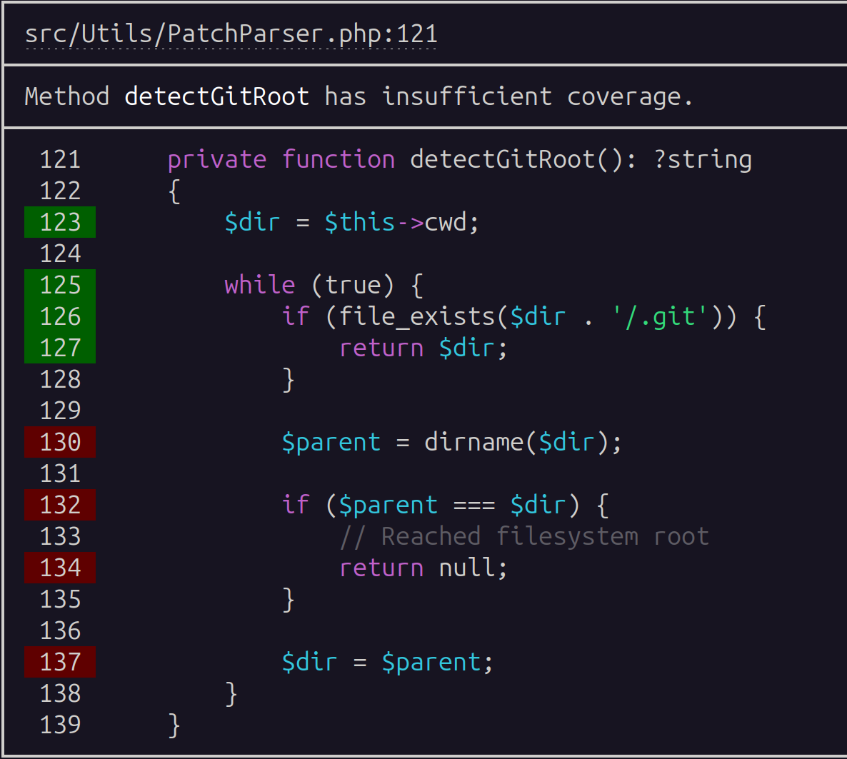 --verbose– show detailed processing information--patch– path to git diff, to check coverage only for changed files & methods--config– path to custom PHP config