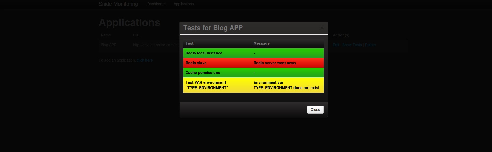 You can add application reference & define its api URL (Example : /dashboard.json). Your application now monitor other applications & tests appear on your dashboard.