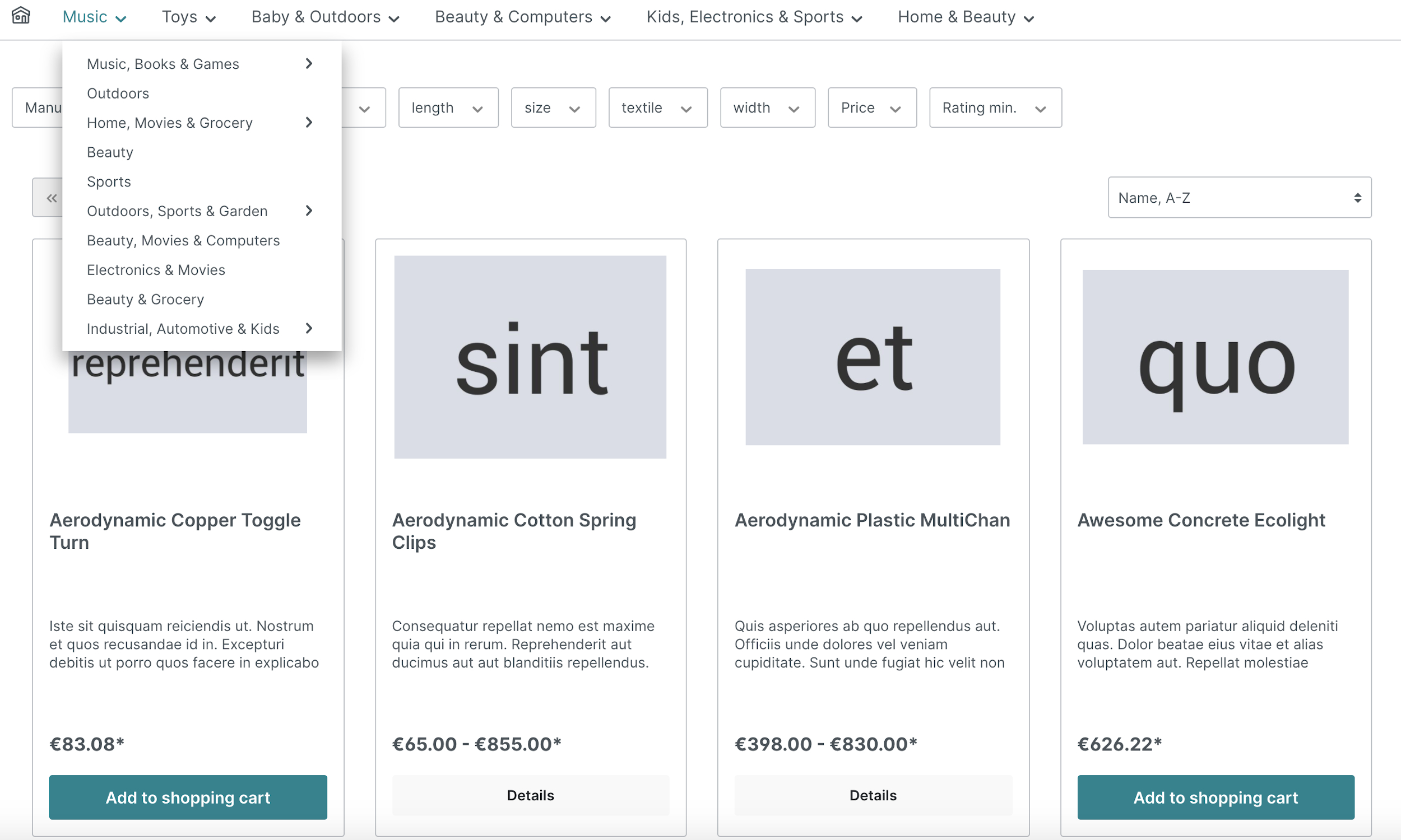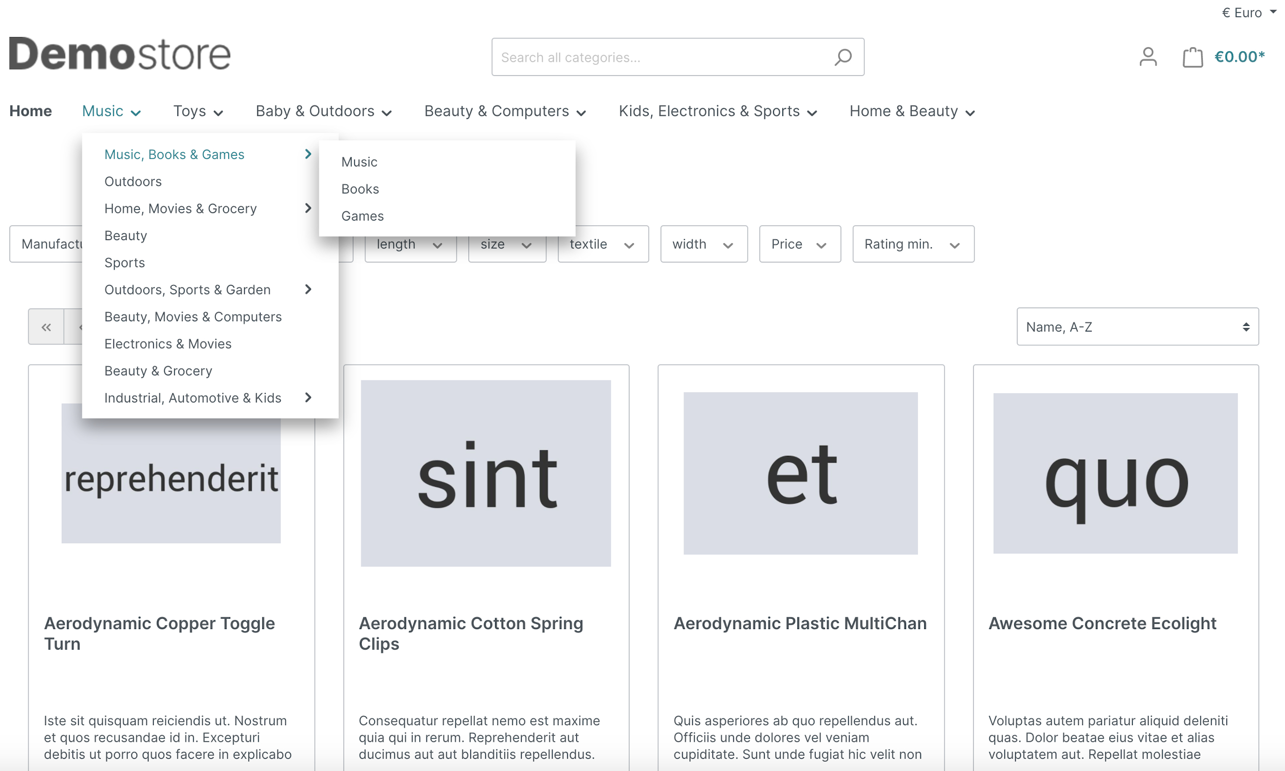 An extension for a dropdown menu from 992 pixels. The navigation menu item Home can also be hidden or can be replaced by a house icon.