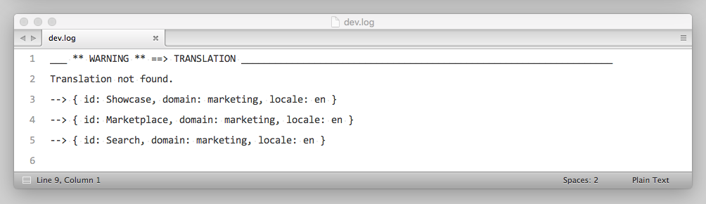 For example, this is a Symfony log file displaying three consecutive missing translation messages: