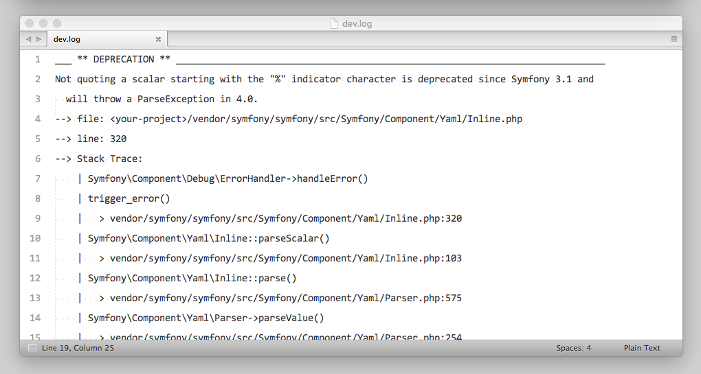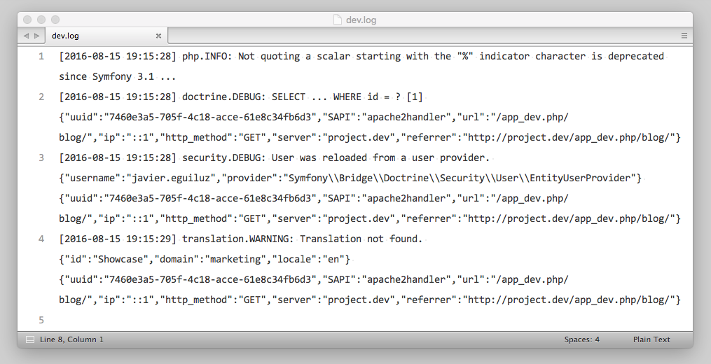 Symfony log files are formatted in the same way for all environments. This means that dev.log is optimized for machines instead of humans. The result is a log file bloated with useless information that makes you less productive.