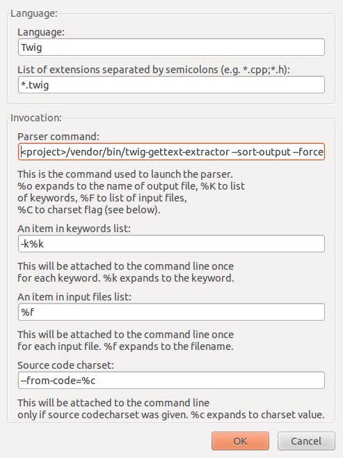 <project>/vendor/bin/twig-gettext-extractor --sort-output --force-po -o %o %C %K -L PHP --files %F