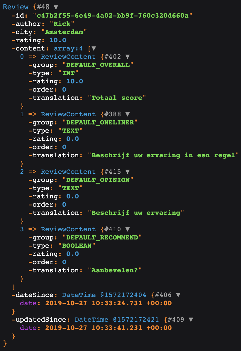 var_dump($kiyoh->getCompany()->getReviews()[0]);
