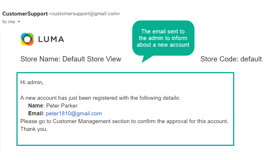 With admins, when a new account has been registered, they will receive emails with details of customer accounts and remind them of approval. Besides, with customers, they will receive the notification emails accordingly when they register accounts successfully and when the accounts are approved or not approved.
