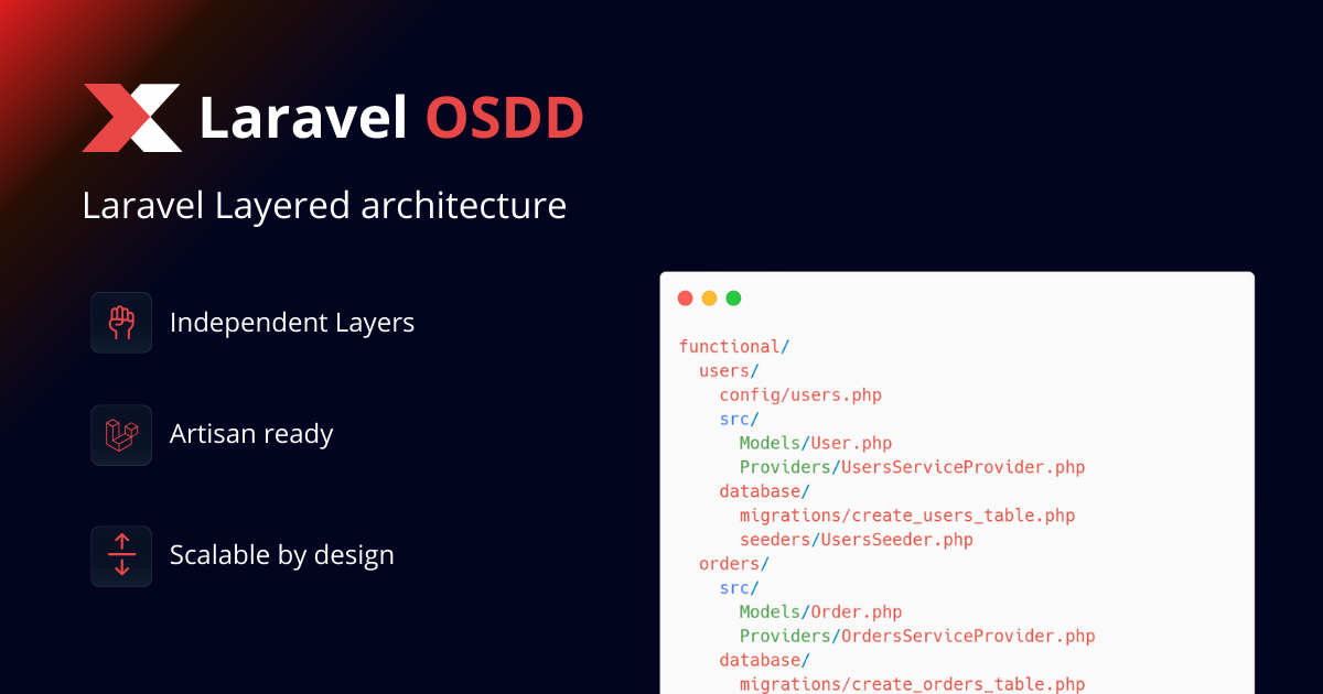 A Laravel package that restructures your application into independently composable layers — each one a self-contained Composer package with its own models, migrations, seeders, tests, and service provider.