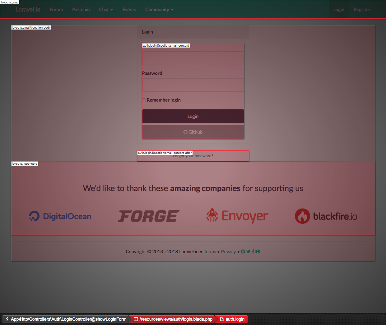 When your Laravel project grows, so do the Laravel views. Sometimes it might be hard to figure out, which part of the output HTML was rendered using which template. With this package, you can take a peek into your Laravel views and find out which template is responsible for which part of the output HTML.